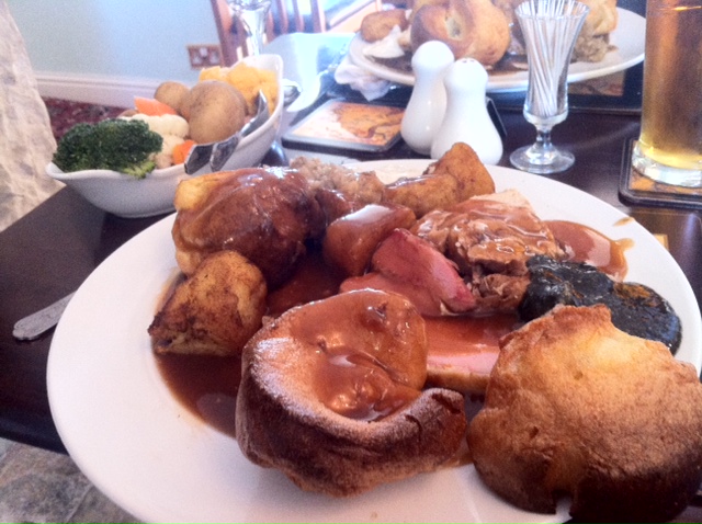 On to the food, it was early Sunday afternoon and we hadn't booked a table in advance which wasn't a problem for the friendly lady who welcomed us into the restaurant. Had we been ten minutes later I don't think they would have been able to fit us in so I would recommend booking ahead. The carvery lunch comes in three sizes: small, medium and large so we promptly ordered two large meals and some drinks which were brought to our table. The large portion certainly lived up to it's billing. We were told we could go up to the carvery and we went for the 'bit of everything' option which consisted of beef, lamb, turkey, ham and roast pork with 8 roast potatoes, three home-made yorkshire puddings and stuffing! There was also a choice of three different types of gravy, one plain, one with mint added and one for vegetarians along with the usual array of condiments you would expect to see. Vegetables were brought to our table in a bowl, which I have never seen before in a carvery and did raise small concerns about wastage - I wouldn't have chosen to put all those veg on my plate.